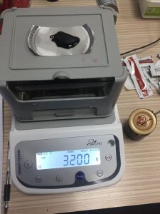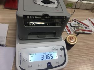 - 將2號阿膠膏體液置于稱(chēng)重臺上,屏幕出現空氣中阿膠液的重量為3.365,按MODE鍵,就記錄了阿膠液在空氣中的重量了。